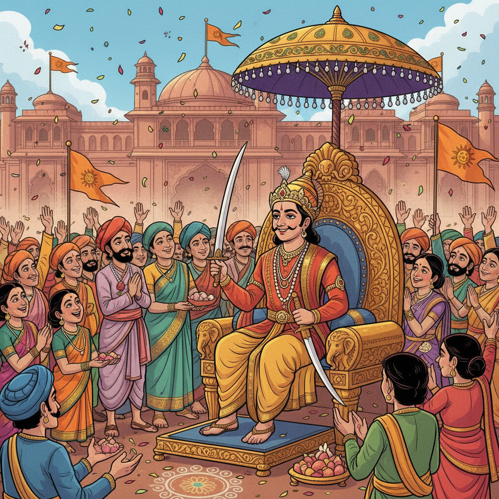 After many victories, the people rejoiced! It was time for Shivaji to be crowned king, Chhatrapati, meaning 'Lord of the Umbrella'!